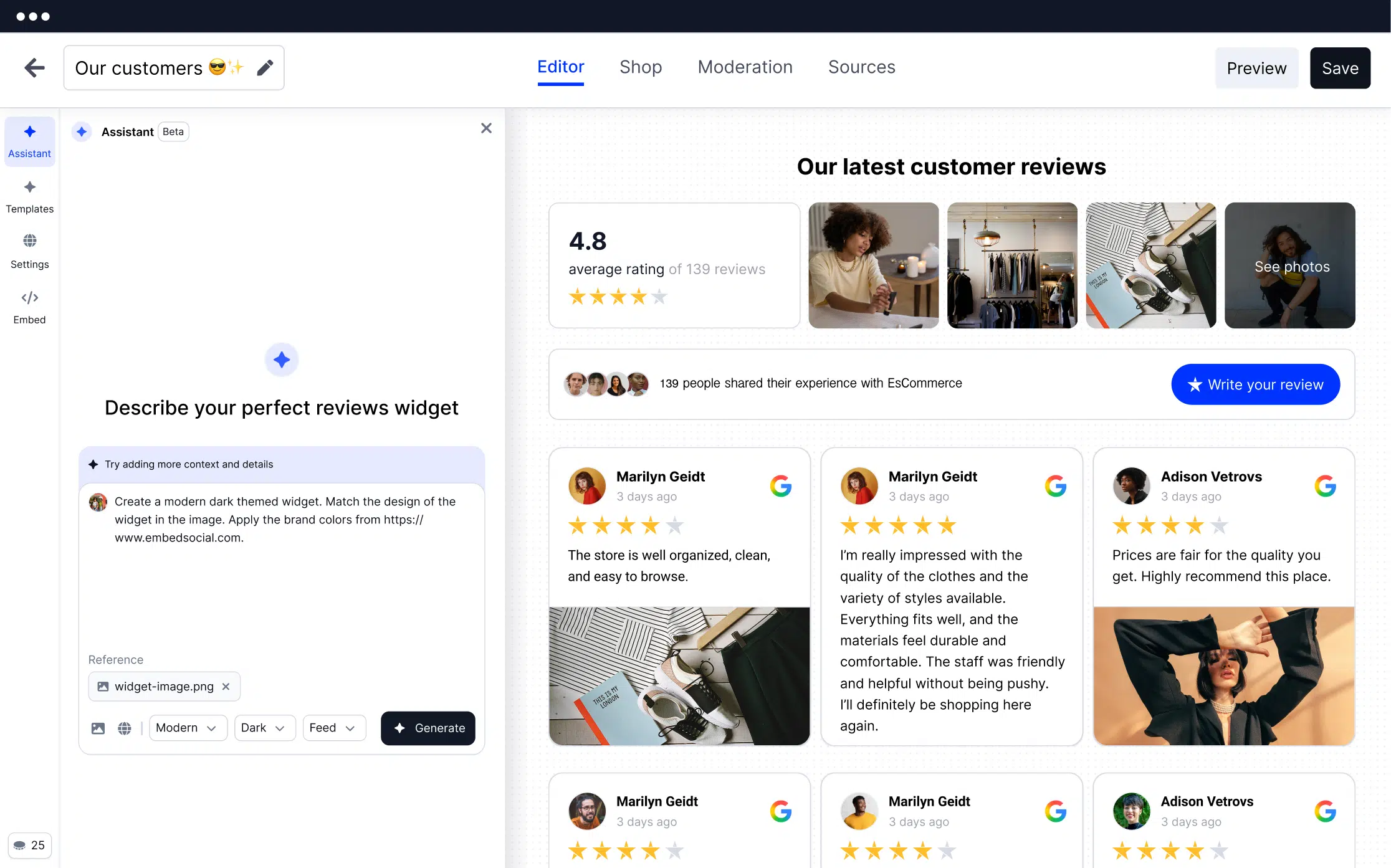We’ve built the first Google reviews widget generator, which automatically creates the widget, designs based on prompts and filters for keywords, usernames, etc.